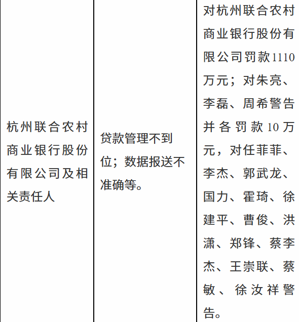 2月6日,国家金融监督管理总局浙江监管局行政处罚信息公开表显示,杭州联合农村商业银行股份有限公司因贷款管理不到位;数据报送不准确等被罚款1110万元。责任人朱某、李某、周某被警告并各罚款10万元。任某菲、李某、郭某龙、国某、霍某、徐某平、曹某、洪某、郑某、蔡某杰、王某联、蔡某、徐某祥被警告。